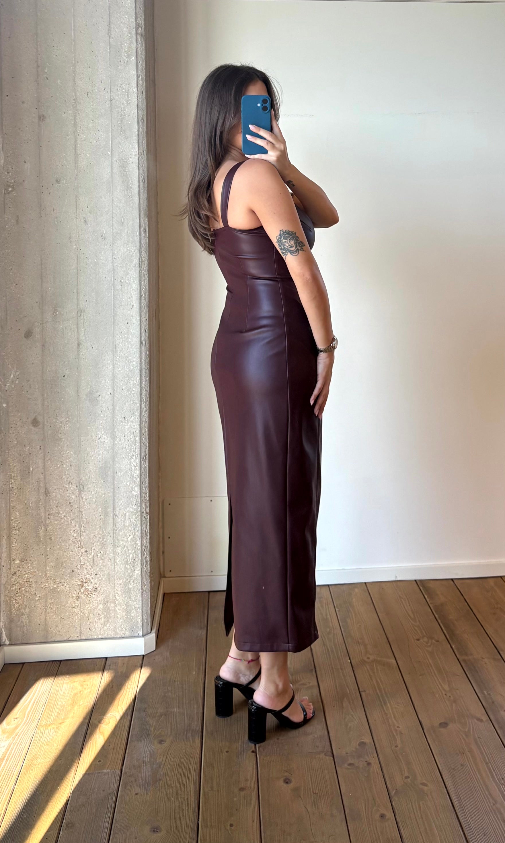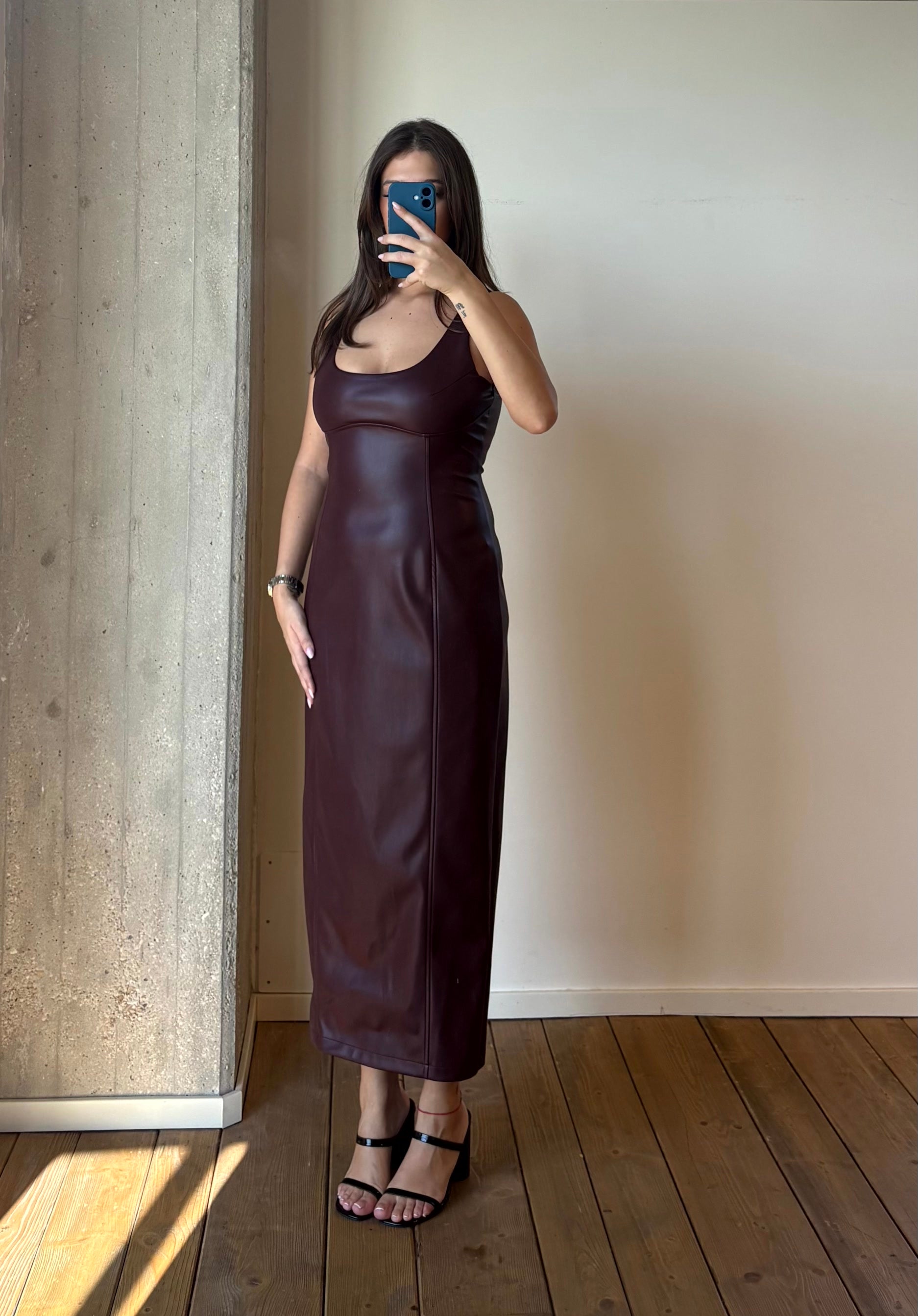 Abito lungo in ecopelle color borgogna, dal design aderente che valorizza la silhouette. Scollo rotondo e spalline larghe per un look essenziale e sofisticato.