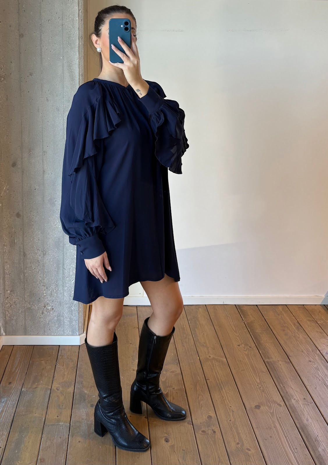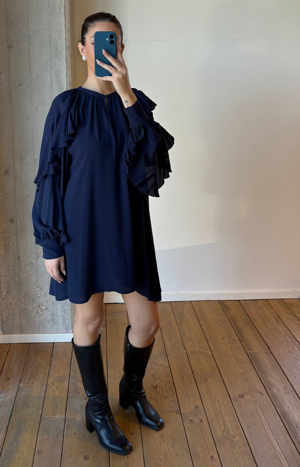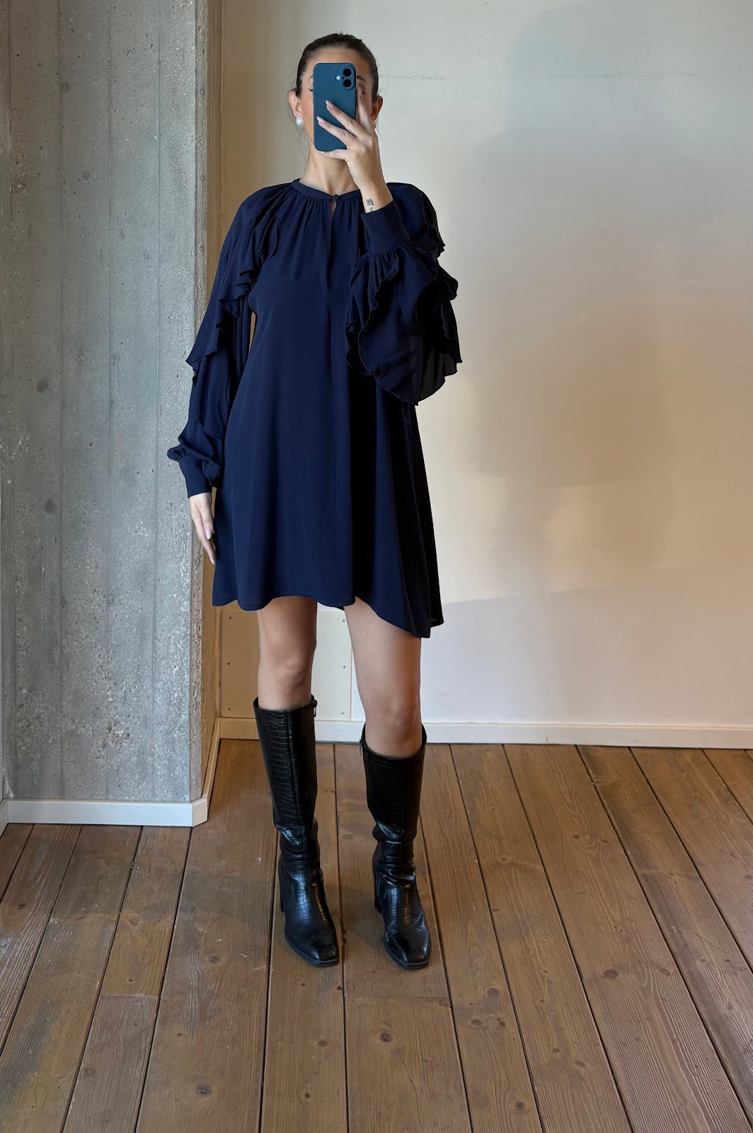 Abito corto in georgette di viscosa con ampi volant che definiscono la silhouette e le maniche. Presenta uno scollo rotondo arricciato con piccola apertura frontale chiusa da un bottoncino e maniche ampie rifinite da polsini abbottonati. Completo di sottoveste in tono, si distingue per la linea fluida e romantica, perfetta per look sofisticati dallo spirito boho-chic. La modella è alta 1,75 m e indossa una taglia 42.