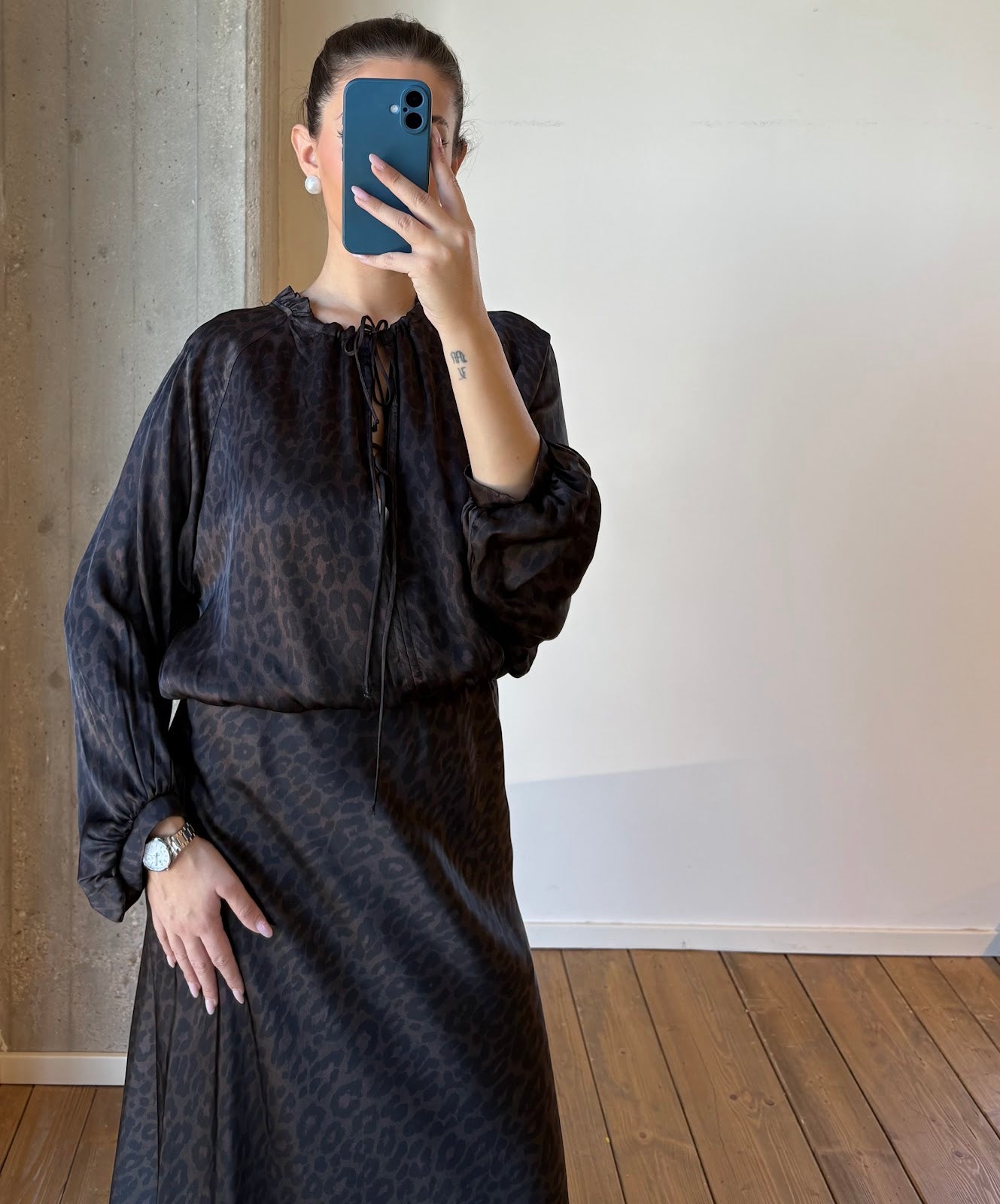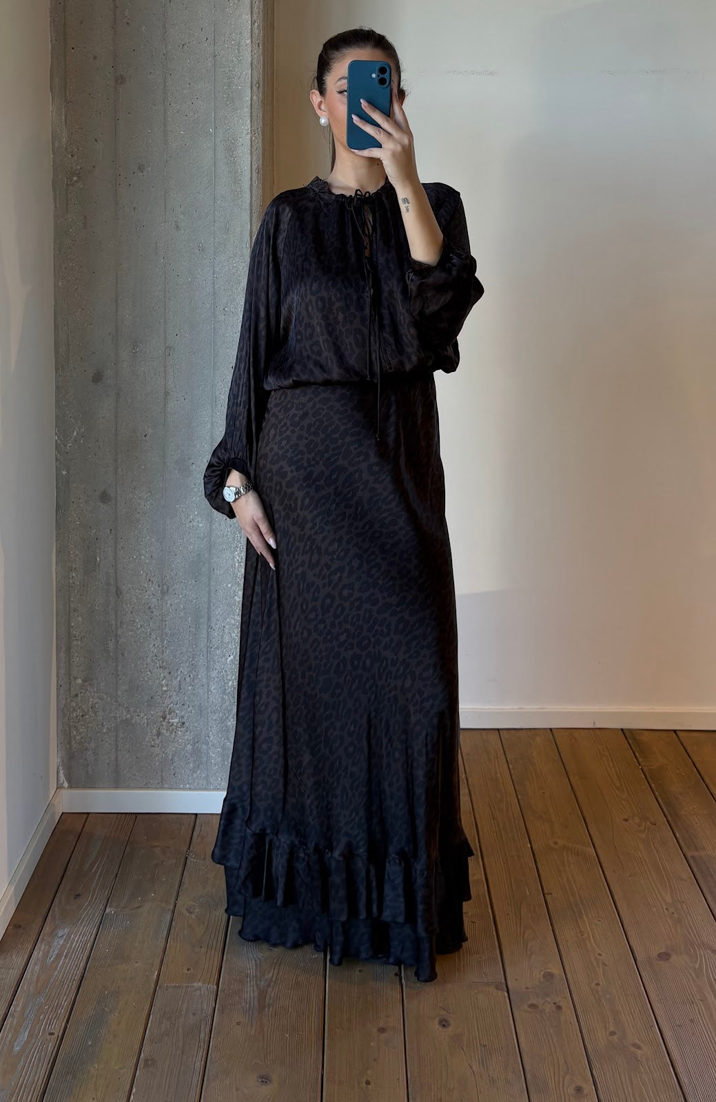 Abito lungo in pura viscosa con stampa animalier e scollo a V regolabile da laccetti sul collo. Le maniche lunghe ampie con polsino sottile e la vita delicatamente segnata donano movimento e femminilità. La lunghezza midi con balze sul fondo esalta il suo stile romantico con un tocco rock, perfetto per look sofisticati dal giorno alla sera. La modella è alta 1,75 m e indossa una taglia 42.