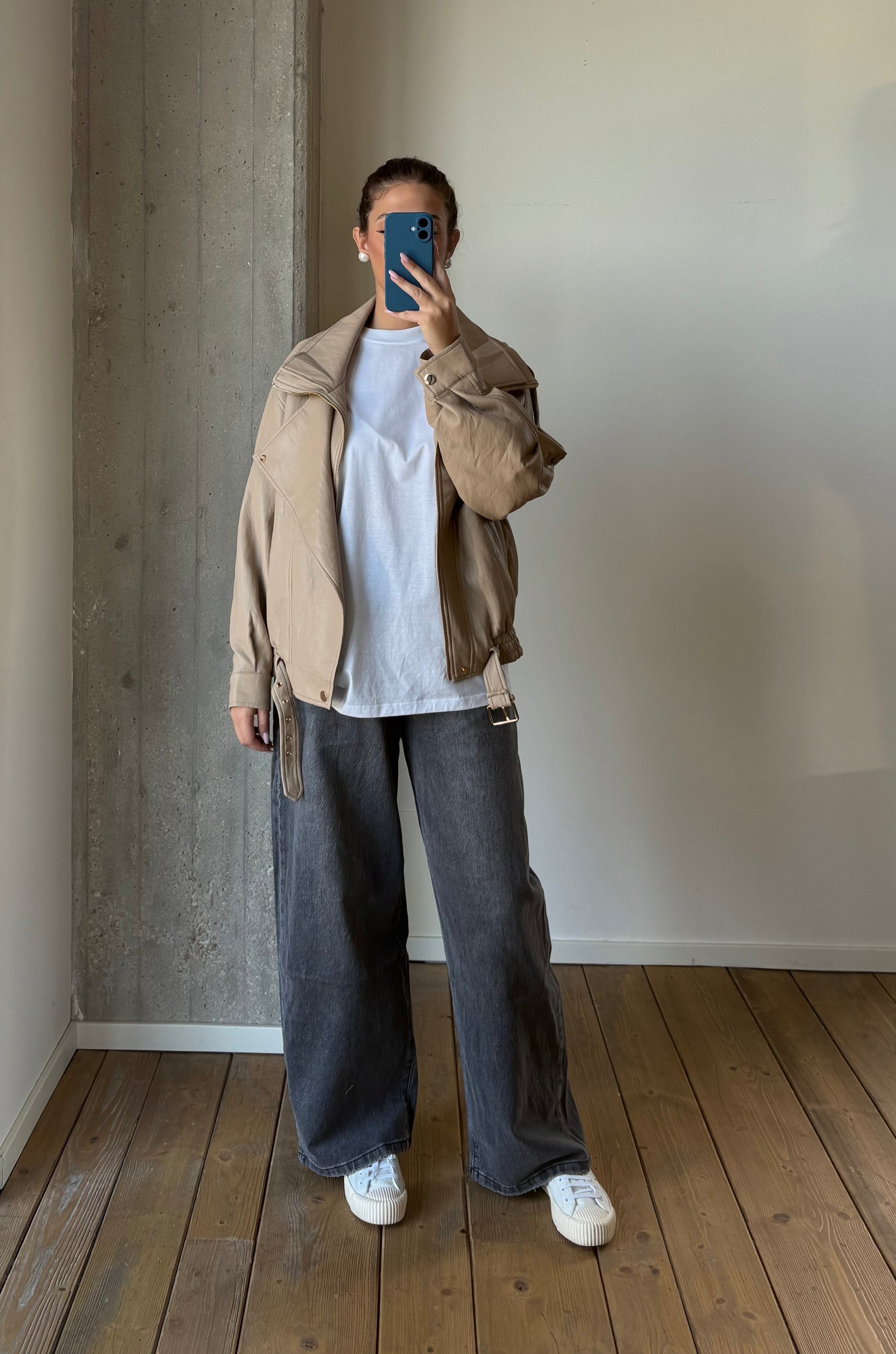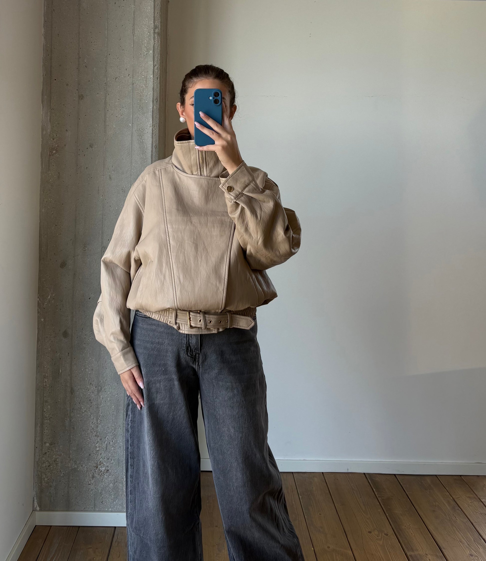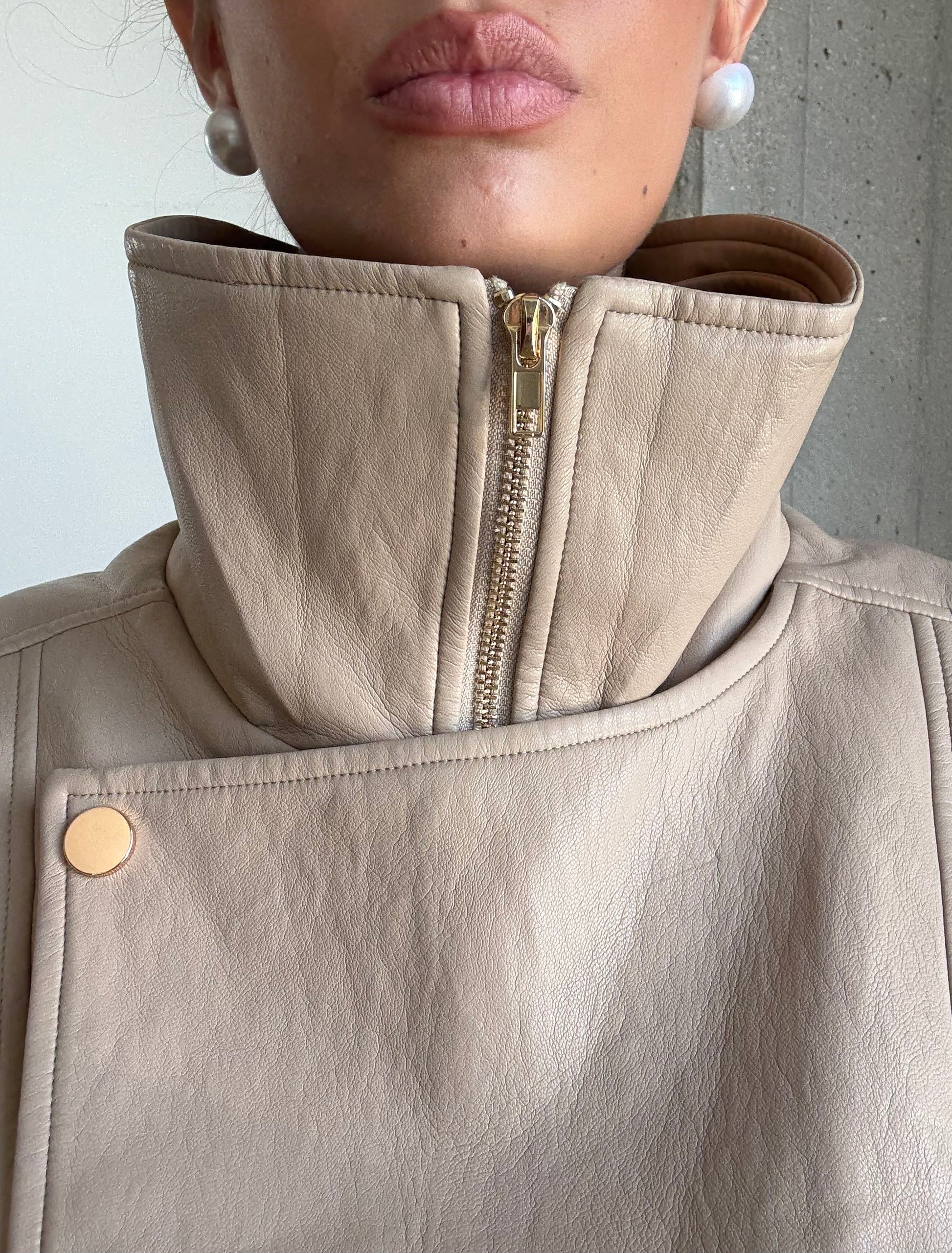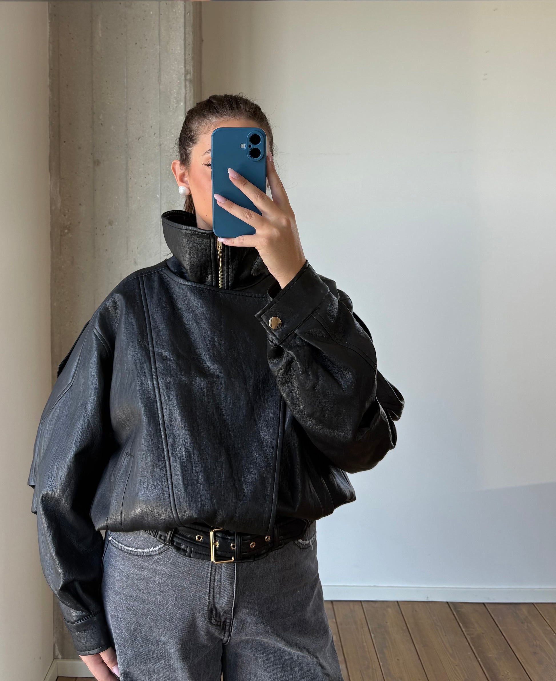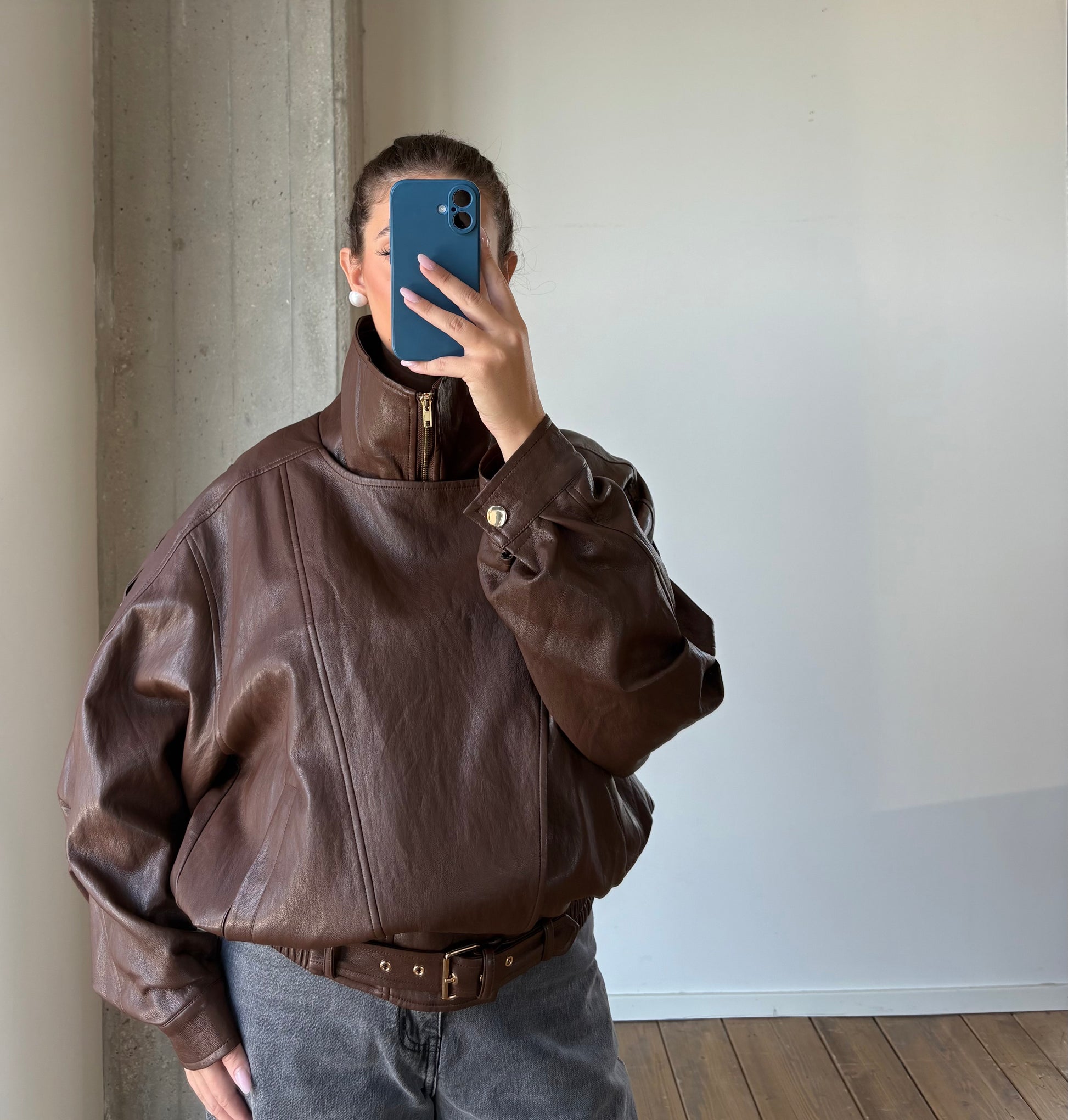 Bomber in ecopello oversize. Doppio petto, cintura finale come chiusura.