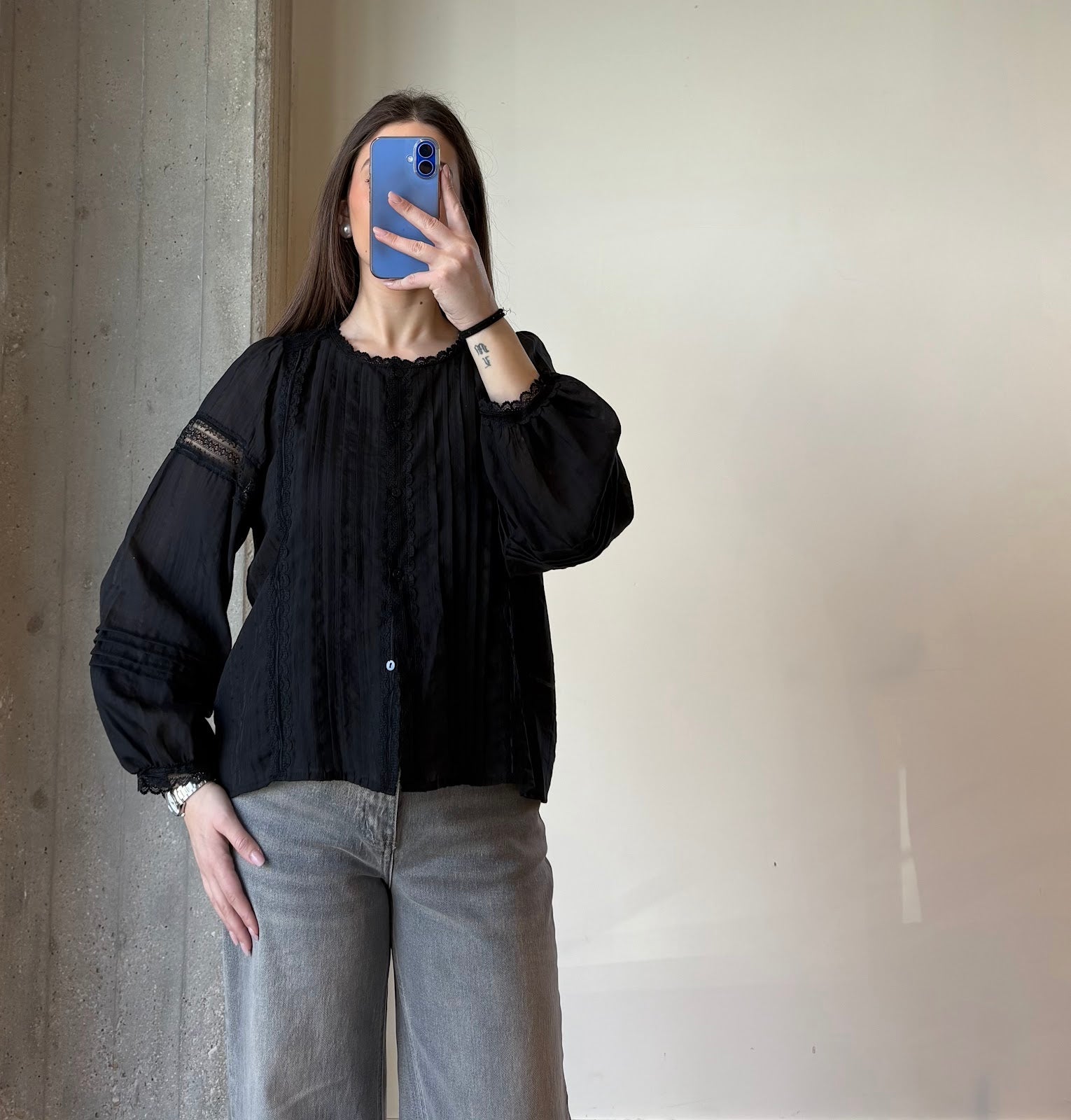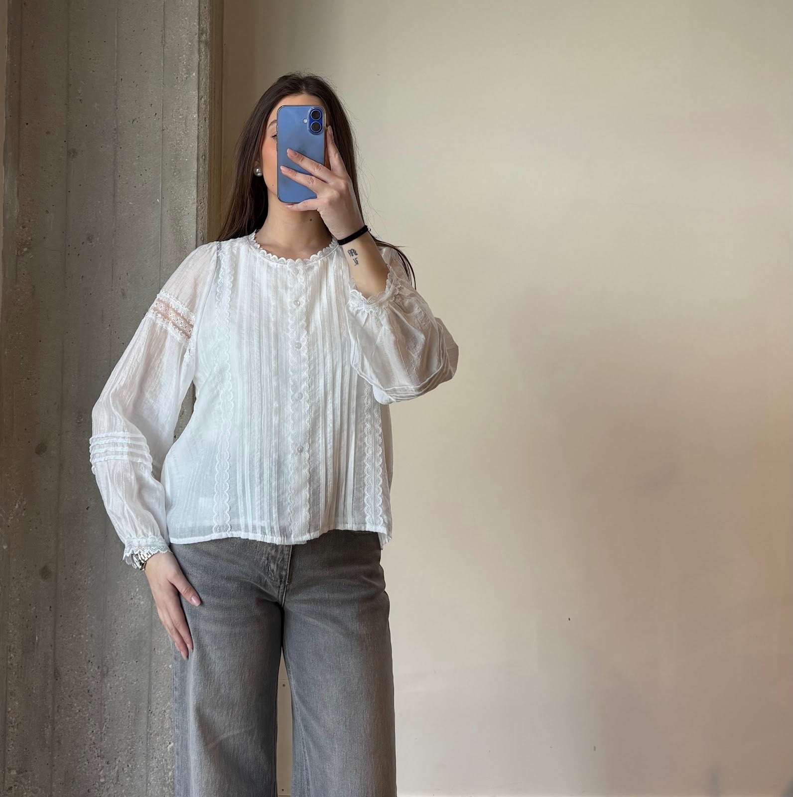 Camicia caratterizzata da una raffinata lavorazione a righe verticali di pizzo tono su tono, chiusura frontale con bottonii in tinta. Le maniche lunghe hanno una linea morbida e leggermente ampia, per una vestibilità confortevole e naturale,