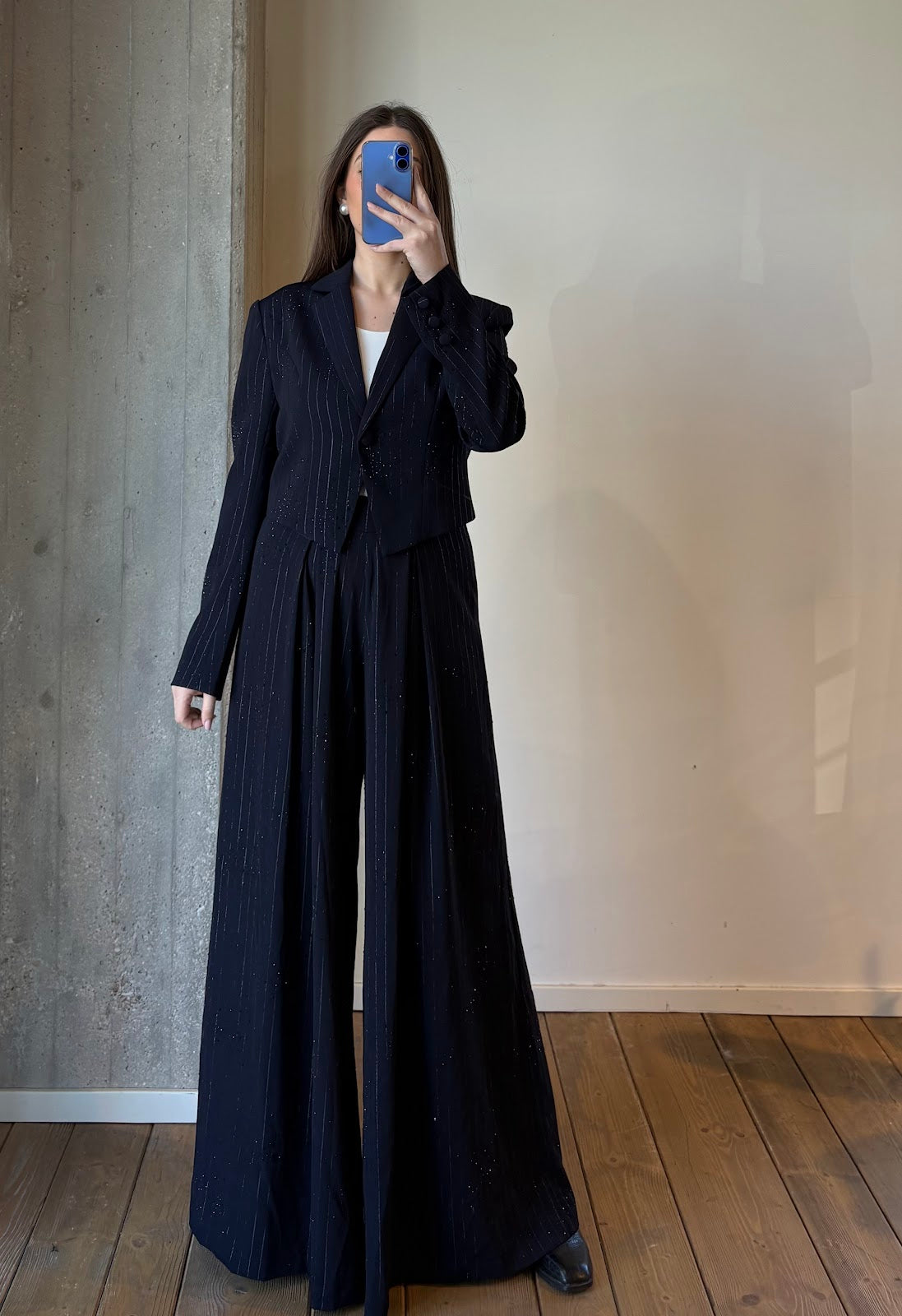 Blazer crop con fit regolare, caratterizzato da una leggera gessatura lurex tono su tono, impreziosito da applicazioni di brillantini tono su tono sparse sul capo.