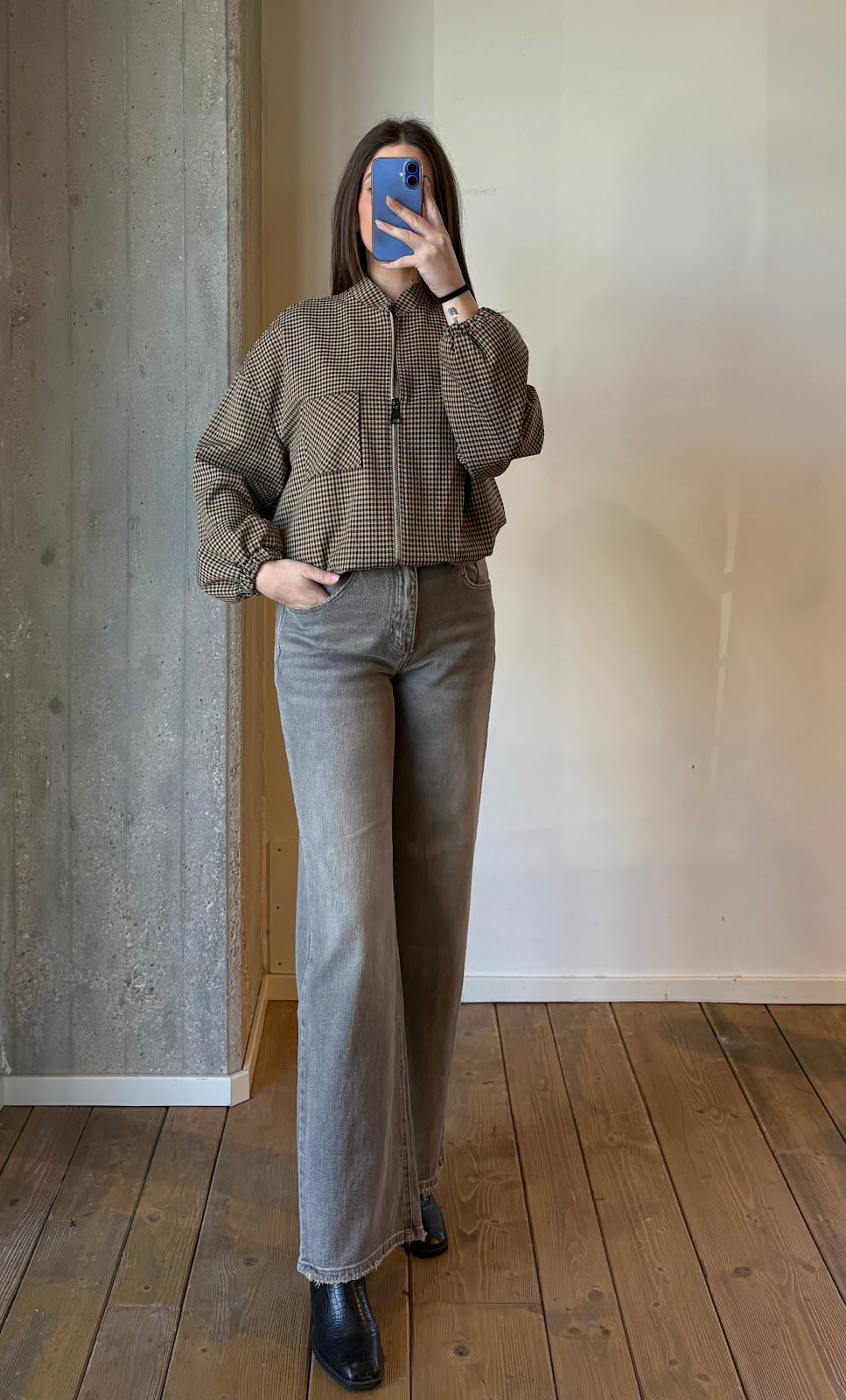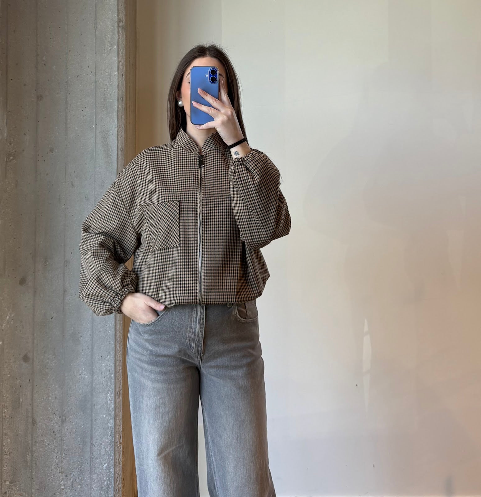 Giacchino con motivo a quadri, chiusura con zip frontale piccolo taschino sul davanti.