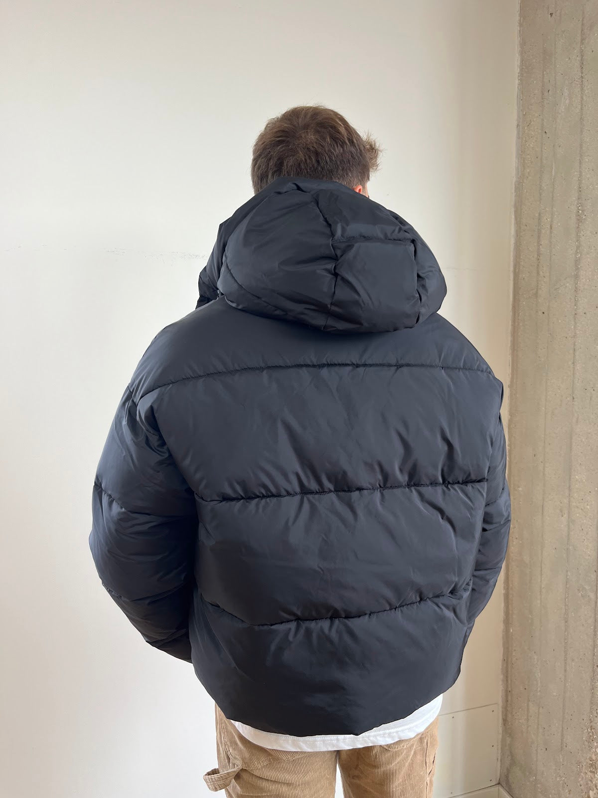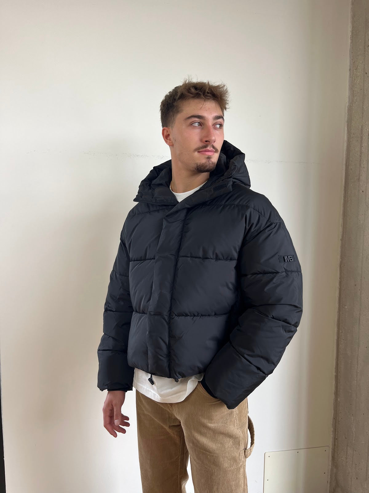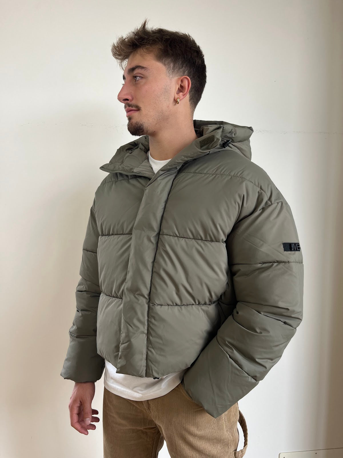 Giubbotto effetto bomber con imbottitura leggera tipo piumino e chiusura frontale con zip. La linea regolare e il design pulito lo rendono un capo pratico e versatile, perfetto per un look casual e contemporaneo. Il modello è alto 1,75 m e indossa una taglia M.