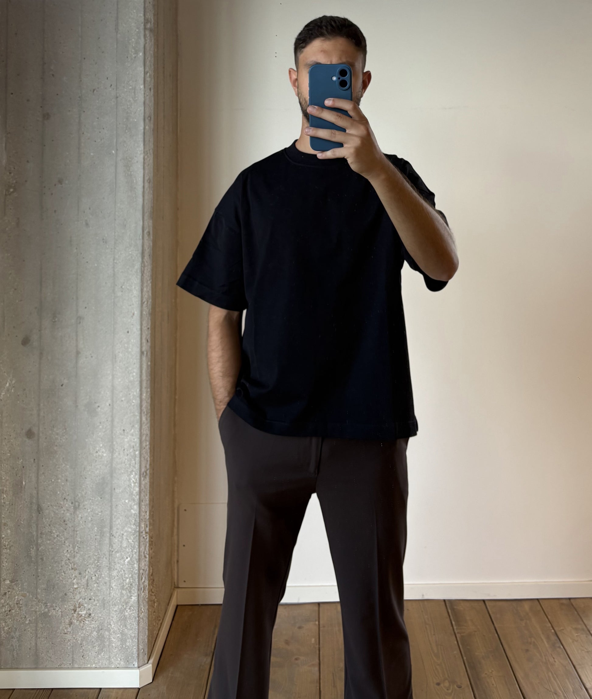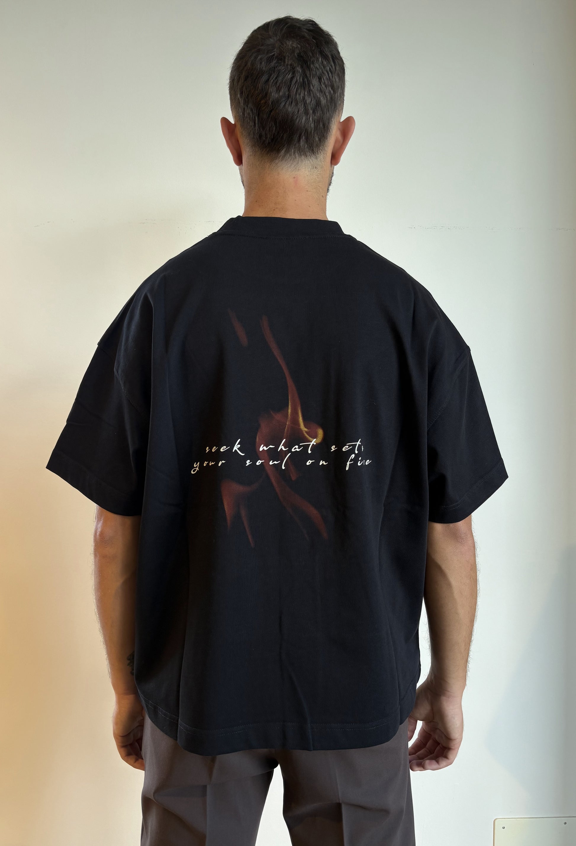T-shirt nera oversize in cotone con linea minimal sul davanti e stampa grafica con fiamma sul retro, accompagnata dalla scritta “seek what sets your soul on fire”